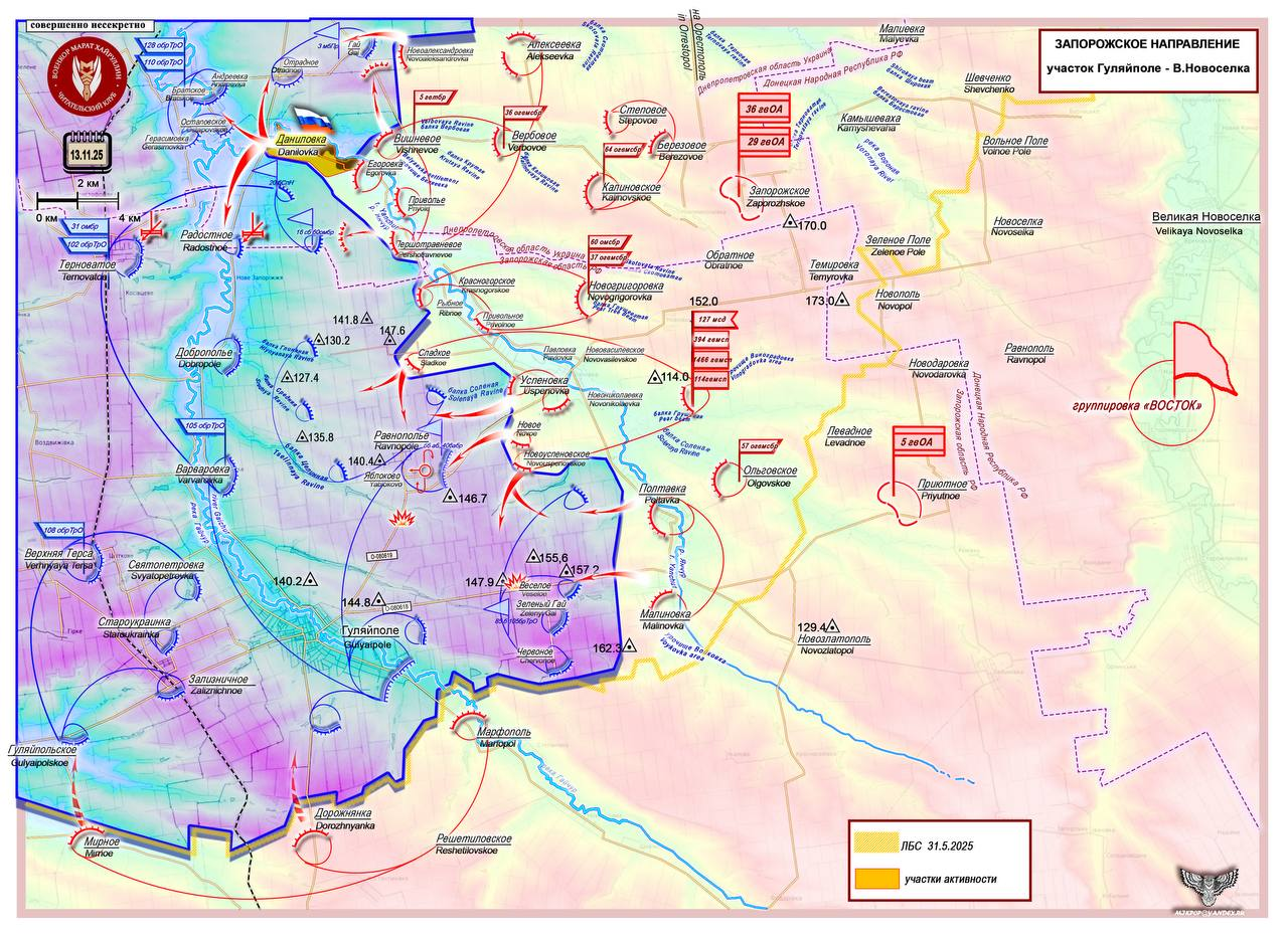 이 방향의 주요 보급로 중 하나인 R-85 고속도로(Vasylkivka - Pokrovskoye - Gulyaipole)가 절단되었다. 그리고 동시에 11월 12일부터 13일까지 밤 우크라이나군의 노드 수송 지역인 Vasilkivka(아래 전황도 왼쪽 상단 폭격 표시 있는 곳) 에 대규모 공습이 가해졌다. 러시아군은 Gaichur 강을 따라 뻗어 있는 우크라이나 군의 다음 방어선 Pokrovskoye - Gulyaipole에 도달한다. 이 선의 최전선은 R-85 고속도로를 따라 강의 오른쪽 기슭에 위치하고 있으며 강 뒤의 방어 깊이에는 여러 수송 및 방어 허브(Ternovate, Verkhnyaya Tersa)가 있다.