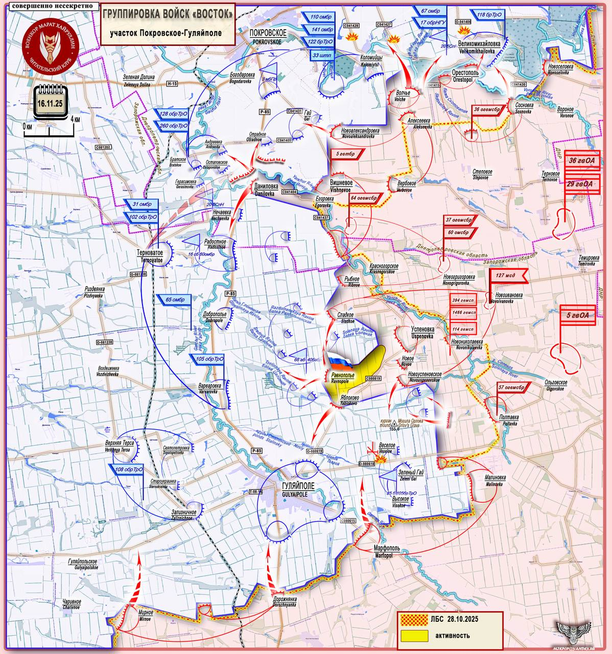 러시아군은 10월 하순에 동쪽의 얀추르강을 도강한 뒤, 또 다른 강인 서쪽의 가이추르강 방향으로 진격하고 있다. 남쪽의 도시 굴랴이폴레를 크게 둘러싸면서 진출하고 있다. 도처에 집게pincer가 형성되고 있고, 따라서 포켓/가마솥이 형성되고 있다. 최근 1주일간은 매일 하나의 정착지를 점령해나가고 있다. 엄청난 속도로 진격 중이다. 얼마전 포스트에서 굴랴이폴레가 2-3달 내로 점령될 것 같다고 했는데, 2-3주면 점령될 속도로 진격하고 있다.
